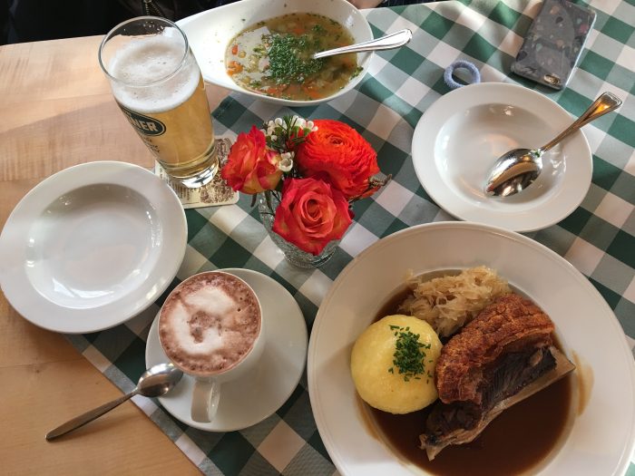 我們都覺得香腸有點太鹹,而剛好桌上有放麵包,就一人拿一個來配著吃。結果結帳時才發現一個麵包 1.1 歐元。😂我們也有點他們的 potato soup,蠻好喝的,有機會來這的話可以喝一下。
