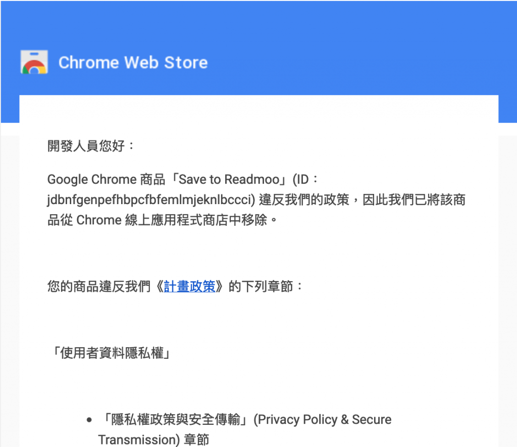Chrome Store 來信說我違反政策,因為沒附上隱私權政策的連結,所以上架失敗。
